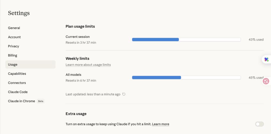 Claude限用让苏玉异常焦虑。在一个周二,苏玉发来一张Claude后台截图,上面显示她本周的限额已经使用了45%。“这周才过去不到两天!我已经用得很节省了,一天只讨论一个论文选题,它就到限额了!”苏玉情绪有点崩溃,谁说AI不能替代人类?这个AI已经快比她的导师还难搞了。