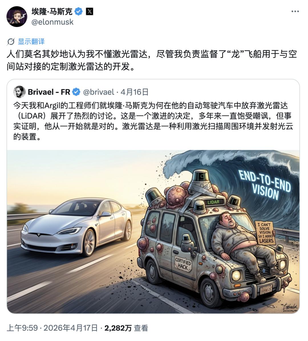 马斯克随后转发这个帖子称:“大家都认为我不懂激光雷达,但我负责监督了龙飞船用于与空间站对接的雷达开发。”