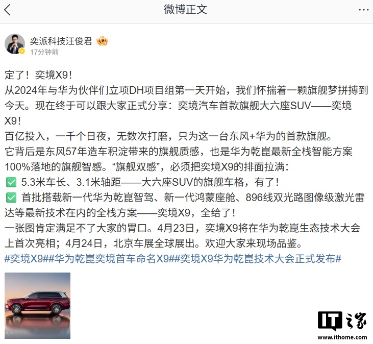 他透露,奕境 X9 拥有 5.3 米车长、3.1 米轴距,首批搭载新一代华为乾崑智驾、新一代鸿蒙座舱、896 线双光路图像级激光雷达等最新技术在内的全栈方案。4 月 23 日,奕境 X9 将在华为乾崑生态技术大会上首次亮相;4 月 24 日,北京车展全球展出。