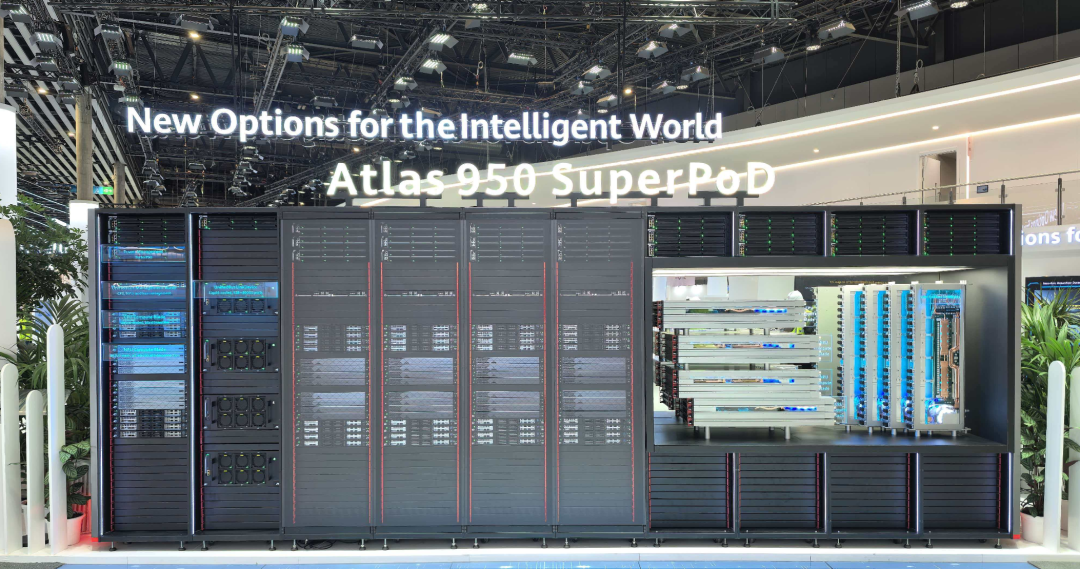 而国产芯片们想要堆出近似算力,就需要拿出更多的芯片。所以去年华为昇腾拿出了 384 超节点,通过 12 个机柜,每个机柜 32 张卡,硬是堆出 300 PFLOPs 算力,接近 NVL72 的两倍了。而今年差评更是在 MWC 现场看到了华为最新的 Atlas 950,也就是 8192 卡互联的超节点。