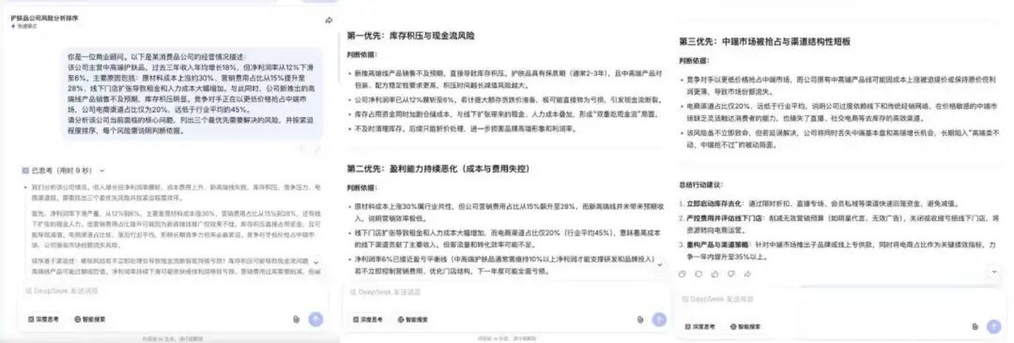 为了验证连续推理能力,我们追问发力电商渠道的风险,响应用时仅3秒,直接在第一轮建立的背景基础上继续推导,V4识别出五项新风险。