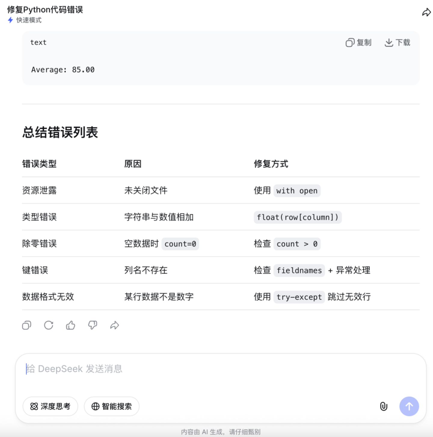 开启深度思考模式响应时间15秒。V4在思考过程中主动梳理了代码的所有潜在问题,最终给出了6项错误分析,超出原题预设的2至3个范围。除了最核心的数据类型错误和文件未正确关闭之外,还额外识别出除零错误、列名不存在时的KeyError等。