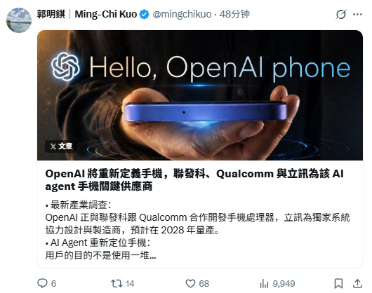 郭明錤:OpenAI联手联发科、高通开发AI手机芯片 预计2028年量产