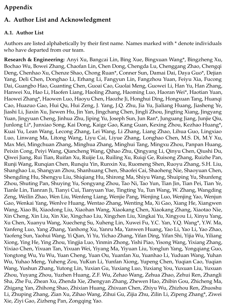 创始人梁文锋与所有研究员、工程师并列署名。名单中 10 人标注“已离职”,其中不乏王炳宣、魏浩然、郭达雅等核心骨干成员。据报道,2025 年下半年至今,DeepSeek 至少 5 名核心研发成员确认离职。