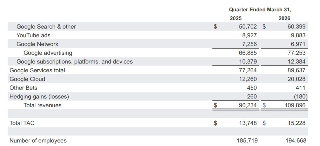 期内,Alphabet实现营收1099亿美元,同比增长了20%,创下了自2022年以来最高季度增长率;实现净利润625.7亿美元,同比增长81%,去年同期净利润为345.4亿美元;每股盈利为5.11美元,而去年同期为2.81美元。