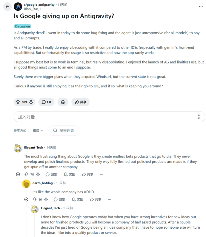 Reddit上甚至有人直接问:“谷歌是不是要放弃Antigravity了?”下面的回答更扎心:“谷歌最让人无语的一点,就是推出没完没了的测试版产品,最后全都不了了之、悄然下架。”