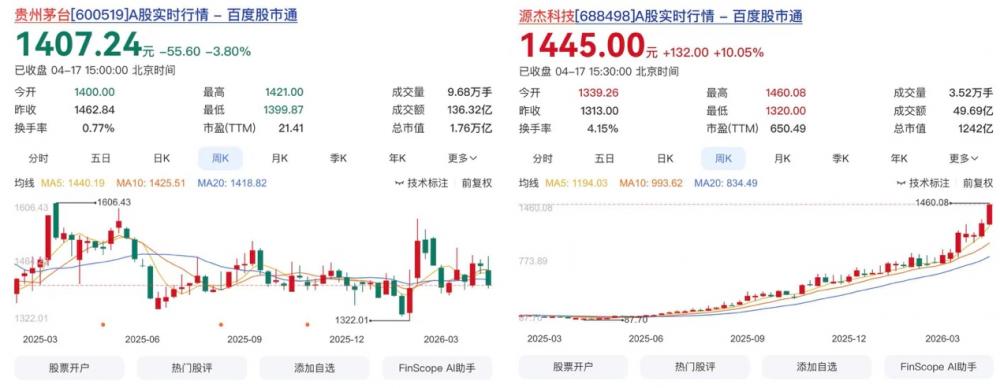 C114讯 4月17日消息(水易)作为国产光芯片龙头企业,源杰科技上市3年多来,股价从100.66元/股的发行价,一跃成为A股第八只千元股,并在4月17日超过贵州茅台,成为A股新“股王”。截至当日收盘,源杰科技涨10.05%,股价1445元/股;贵州茅台跌3.8%,股价1407.24元/股。