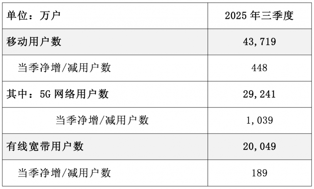 C114讯 10月21日消息(水易)今日,中国电信公布2025年第三季度主要运营数据。2025年第三季度,中国电信移动用户数净增448万户,移动用户数累计4.3719亿户。其中,5G网络用户数当季净增1039万户,5G网络用户数累计2.9241亿户,渗透率为66.9%。