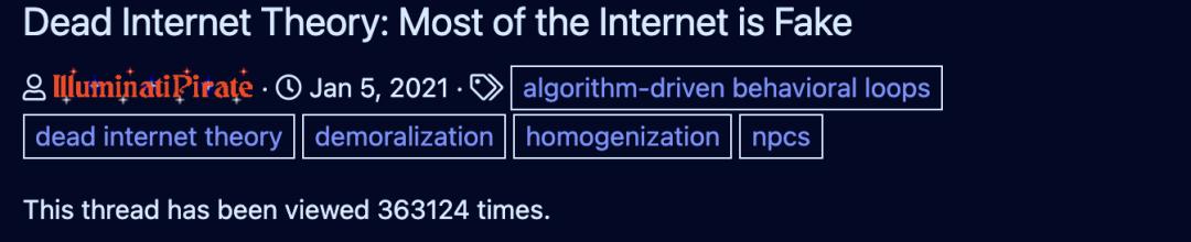 2021年,用户IlluminatiPirate在Agora Road论坛发帖提到了「死亡互联网理论」,这位网友对其的定义就是「大多数互联网变得虚假」。