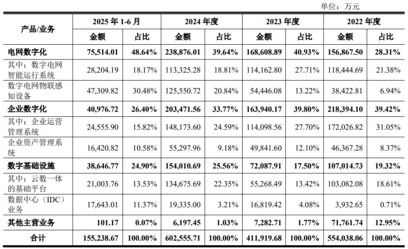 具体来看,2022年、2023年、2024年、2025年1-6月(简称“报告期”),南网数字的电网数字化业务营收占比呈上升趋势,企业数字化的营收占比有所下滑。
