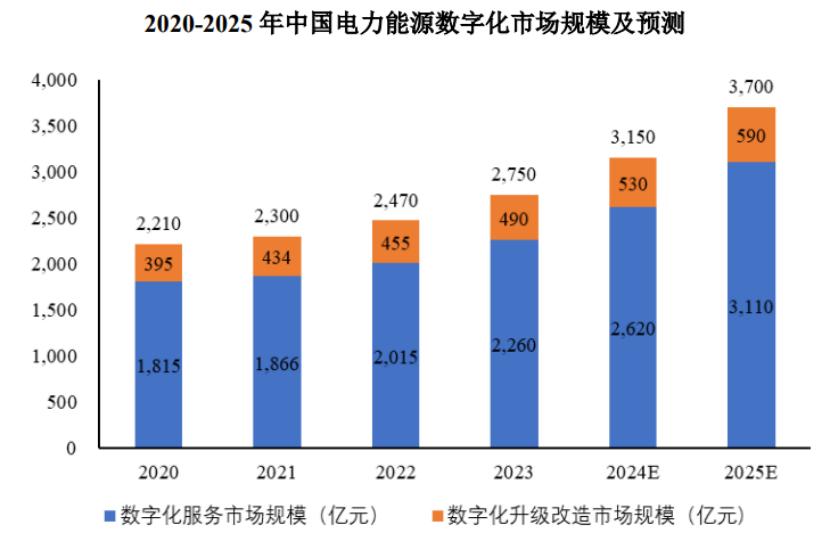 其中,数字化服务主要涉及智能电网、自动化控制、巡检运维、灵活性服务、能源管理系统等,2024年市场规模约2620亿元,占比约83%,且呈持续提升趋势,预计2025年数字化服务市场规模将达到3110亿元。