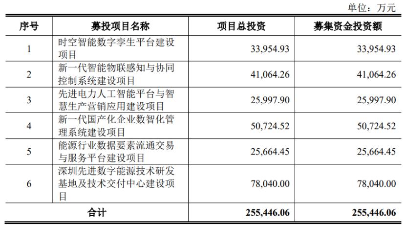本次IPO,南网数字拟募集资金约25.54亿元,用于时空智能数字孪生平台建设项目、新一代智能物联感知与协同控制系统建设项目、先进电力人工智能平台与智慧生产营销应用建设项目、新一代国产化企业数智化管理系统建设项目、能源行业数据要素流通交易与服务平台建设项目、深圳先进数字能源技术研发基地及技术交付中心建设项目。
