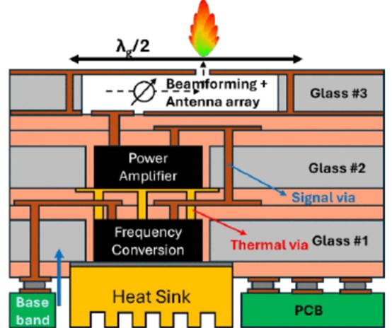 玻璃凭借其高频传输特性和极低损耗,成为支持>100GHz数据速率的6G无线通信网络的理想材料。通过在堆叠玻璃中实现异构集成,可将高频前端芯片与低损耗互连技术整合于大规模天线阵列中。