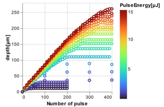 图3:孔深随脉冲能量增加而增大,但存在上限。