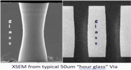 沙漏状结构被认为最适合实现铜物理气相沉积(PVD)工艺的无空隙填充。采用湿法蚀刻槽所达到的纵横比(深度/直径)范围为4:1~20:1(玻璃厚度200微米)。“在高产量制造环境中,关键考量包括:优化蚀刻速率的化学配方、确保均匀蚀刻的流体动力学设计,以及实现工艺稳定性的精准温控与流量控制,”Govindarajulu强调道。