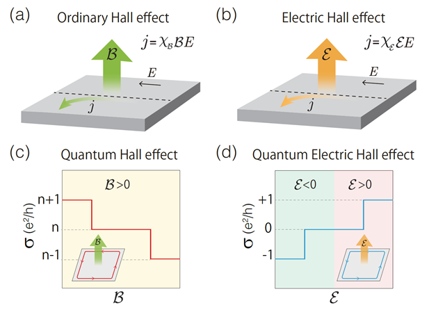 图1 (a) 常规霍尔效应,(c) 量子霍尔效应;(b)与(d) 分别展示了电霍尔效应和量子电霍尔效应,它们可被视为常规霍尔效应与量子霍尔效应的电场对应。