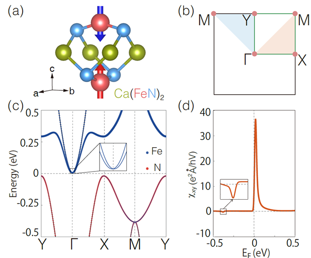 图2 单层Ca(FeN)2 的(a)结构示意图与(b)布里渊区;(c)考虑自旋轨道耦合下的Ca(FeN)2 的轨道投影能带结构,插图显示了在Γ 点处的线性色散的能带交叉;(d)χxy 随费米能级EF 的变化关系,插图展示了源自M 点处线性外尔点的小峰值。此处采用的gE = 0.23,其数值来自第一性原理计算。