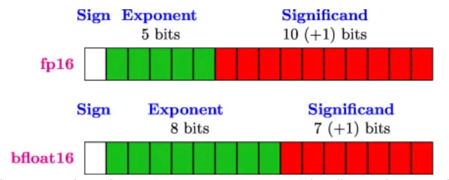 bfloat16 是一个巧妙的工程妥协:它保留了与32位浮点数 (FP32) 相同的8位指数,但将尾数截短至7位。