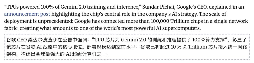 谷歌CEO劈柴明确表示:「TPU为Gemini 2.0的训练和推理提供了100%的动力」。