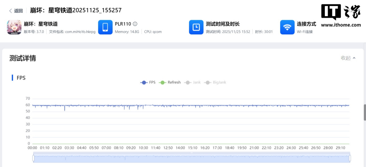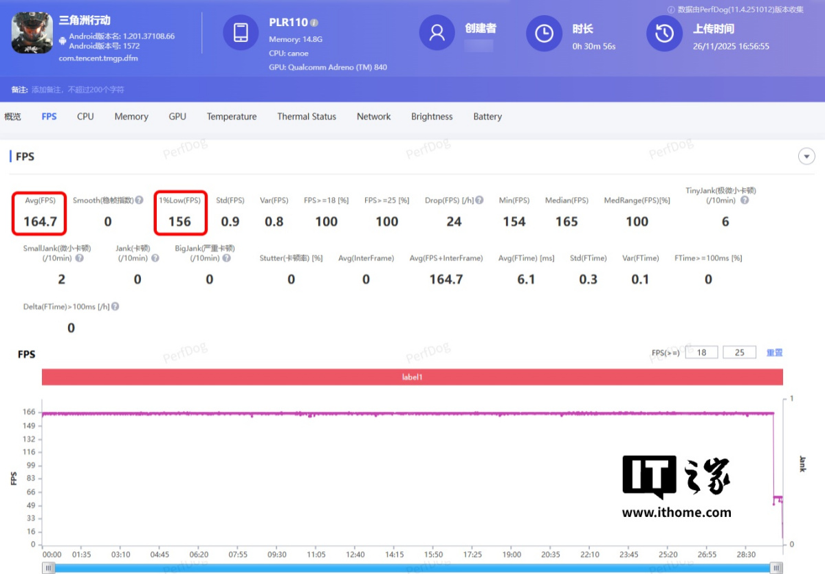 进入游戏后我们开一局“搜打撤”模式,30 分钟后游戏平均帧数高达 164.7 帧,帧率曲线非常平直,1% Low 竟然也达到了 156 帧!无论是在搜寻物资还是激烈对战中,帧数输出始终保持一条直线,画面视觉和触控操作都非常流畅。