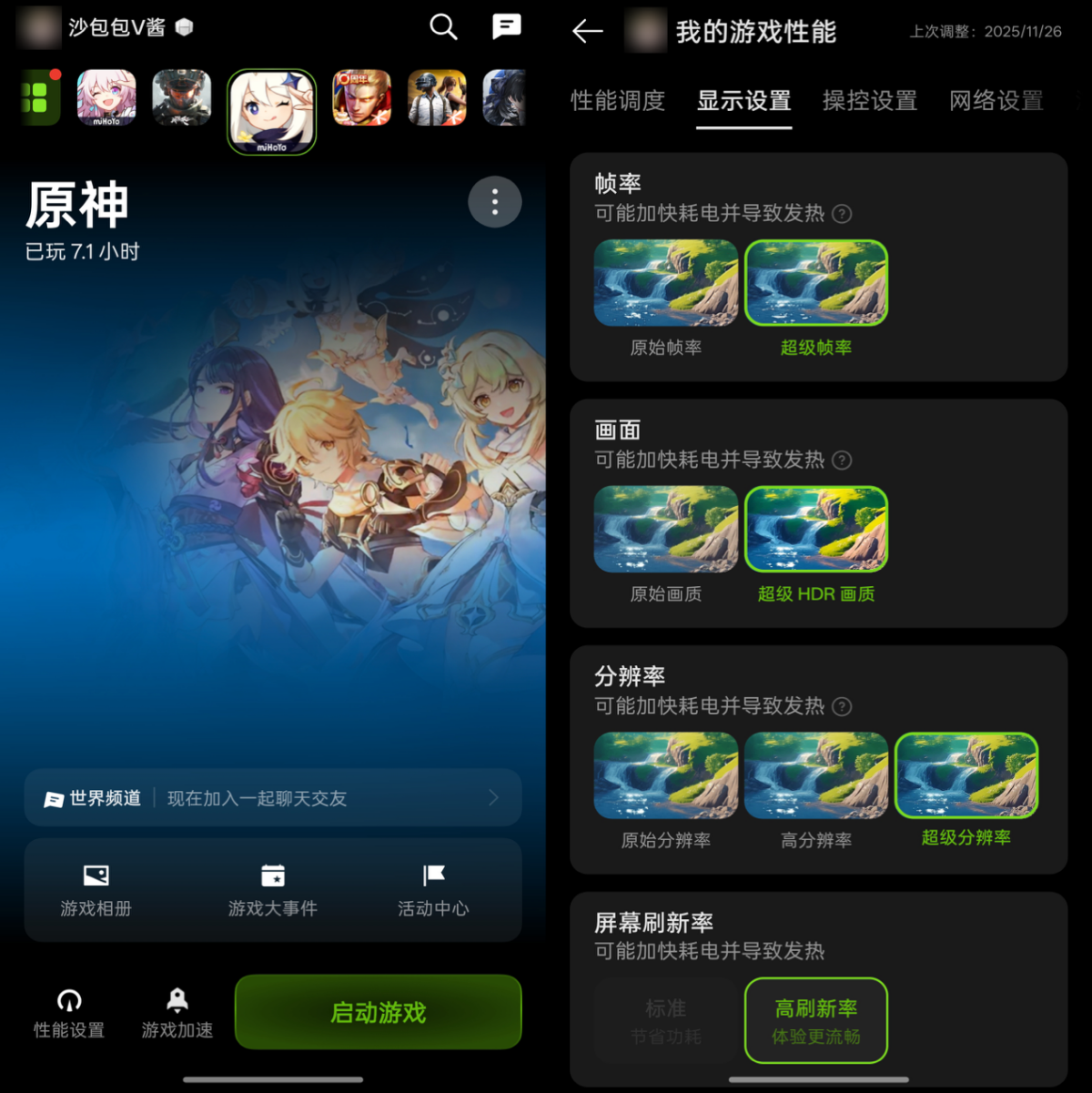 最后一款游戏,我们选择了优化相对比较成熟的《原神》,在原生画质和帧数设置下它早已脱离了高负载手游行列。不过,目前《原神》依旧不支持高刷,刷新率依旧只有 60Hz,因此我们通过一加的游戏助手,为它解锁 1080P 高分辨率 + 120Hz 高帧率,考察一下一加 Ace 6T 的超分超帧并发效果。