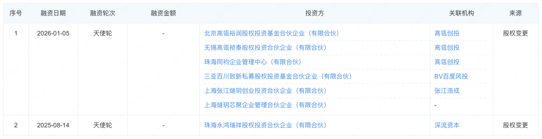 企查查数据显示,高瓴创投旗下在家机构分别认缴出资3.0157万元,投资比例分别为3.0303%;BV百度风投旗下三亚百川致新私募股权投资基金合伙企业(有限合伙)认缴出资额4.5236万元,投资比例为4.5455%;上海燧玥芯聚企业管理合伙企业(有限合伙)认缴出资额1.4929万元,投资比例1.5001%。