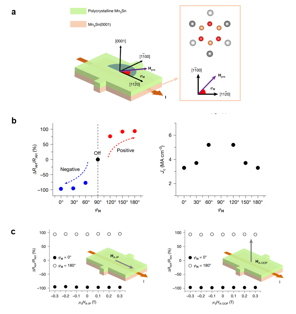 通过满足单晶和多晶Mn3Sn所需的不同生长条件,利用分子束外延生长技术构筑了手性反铁磁Mn3Sn同质结(图1a),利用Mn3Sn(0001)产生面外自旋极化(σz),翻转在多晶Mn3Sn层的手性反铁磁序。通过面内大磁场进行预磁化(图1a),操控Mn3Sn(0001)层的磁序取向,进而控制磁自旋霍尔效应,实现零场翻转的开关和极性的反转(图1b)。对比铁磁翻转极易受外磁场的干扰,手性反铁磁的全电学翻转呈现出优越的抗磁场干扰特性(图1c)。