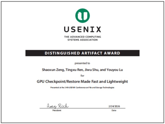 2月24日至26日,第24届USENIX文件与存储技术会议(USENIX Conference on File and Storage Technologies, FAST)在美国圣克拉拉举行。清华大学计算机系存储实验室研究论文“GPU检查点保存和恢复的快速和轻量级方案”(GPU Checkpoint/Restore Made Fast and Lightweight)获得杰出技术贡献奖。该论文第一作者为计算机系2021级博士生曾少勋,导师为计算机系副教授陆游游。