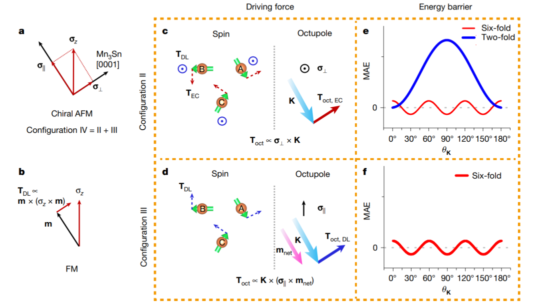 研究团队从磁八极子视角出发,对自旋力矩特征(贡献翻转所需的驱动力)和磁各向异性特征(影响翻转所需克服的能垒)做了系统的理论分析,揭示了两方面关键机制:(1)磁易面约束下,手性反铁磁和铁磁对于面外自旋的响应有本质区别(图2a和b),垂直于磁易面的分量会产生交换耦合力矩,贡献的驱动力如图2c所示,是高力矩效率的主要来源;而平行于磁易面的分量产生的驱动力(图2d)用以决定零场翻转的极性。手性反铁磁同质结中,面外自旋极化与Kagomé磁易面成倾斜的几何构型,既实现了全电学翻转,又保留了较高的力矩效率。(2)易面所贡献的能垒极低(图2e和f),利于高效翻转,然而却会使手性反铁磁的翻转不完全。而若为了实现100%翻转而引入二重磁各向异性,却会使能垒成数量级地提升,极大限制翻转效率。在传统的构型中,驱动力优势和能垒优势始终无法共存,而倾斜的几何构型(图2a)和多晶Mn3Sn的易面磁各向异性(图2b),则成功突破了这一限制,造就了极高的电学翻转效率。