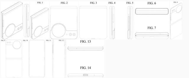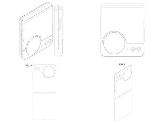 据介绍,这套专利从多个角度展示了这款小折叠手机,整体上依然采用类似 Galaxy Z Flip 系列的翻盖式折叠结构,最大的变化在于机身外屏正面有一个小型圆形开孔,可能是副屏。