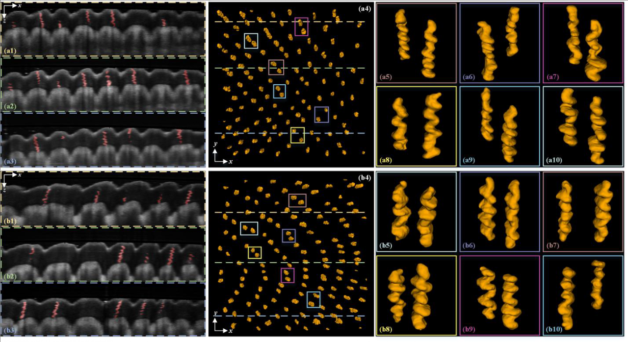 皮肤汗腺是人体调节体温的重要“散热装置”,也是多种皮肤疾病的病灶所在。在题为《3D deep-learning-based segmentation of human skin sweat glands and their 3D morphological response to temperature variations》研究中,团队基于前述工作研发的tGT-OCT无散斑成像和三维图像深度学习分割等技术,首次实现了在体汗腺三维形态无损获取与定量分析,图3所示。通过tGT-OCT获取高质量的人体皮肤3D图像并结合三维深度学习分割,研究定量揭示了人体汗腺三维螺旋结构及其在不同温度下的三维形态变化,例如在43℃相较10℃条件下汗腺体积、表面积和导管长度分别增加42.0%、26.4%和12.8%(p<0.001)。该研究为皮肤腺体功能评价及相关疾病诊断提供了实时、无创、可量化的新手段,推动了皮肤病学和生理学研究的深入发展。