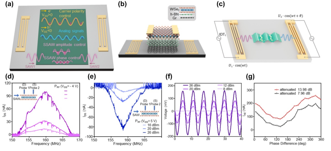 图1.(a)声电平台功能示意:包括声电流极性控制、直流与交流模拟信号处理,以及SSAW振幅与相位调制。(b)声表面波叉指换能器(IDT)与二维材料场效应晶体管(FET)的相对位置及结构示意图。(c)基于SSAW的载流子操控示意图。(d)、(e)栅控直流声电流随射频信号频率的变化关系,分别对应正、负声电流。(f)平台对简单交流信号的声电响应。(g)声电流对SSAW相对相位的依赖关系。