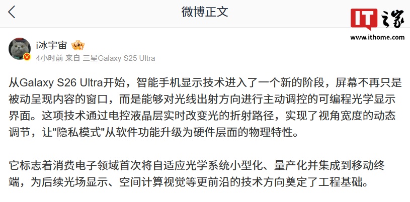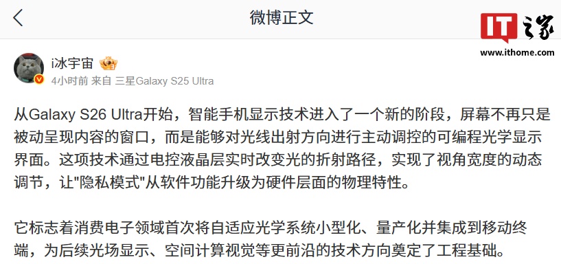 IT之家 1 月 29 日消息,博主 @i冰宇宙 今日发文介绍,三星 Galaxy S26 Ultra 的隐私屏幕本质上是一个通过分子级可控光学结构,对光传播方向进行主动管理的可编程显示屏。