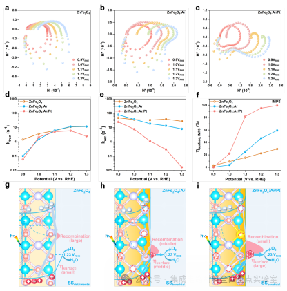 如图4-5所示,多项原位谱学表征共同揭示ZnFe2O4光电极性能的大幅提升主要源于表面电荷转移效率的根本性改善。其中,表面态作为主导性的半导体界面电荷行为调控中心,深刻影响着载流子的分离、捕获与输运动力学。为进一步揭示其微观机制,研究进一步综合联用光电化学阻抗谱(PEIS)与强度调制光电流谱(IMPS)等表征技术,结合等效电路拟合,系统获得了ZnFe2O4光阳极的表面态电子结构及对应的载流子转移阻抗数据。结果表明,通过单原子Pt与氧空位的协同作用,成功实现了表面态重构,使其从原有的不利复合中心转变为高效的载流子传输通道,显著抑制了界面复合损失,从而有效提升了器件的表面载流子转移效率。在此基础上,研究明确了表面态电子结构与ZnFe2O4光电化学器件性能之间的内在构效关系,为面向高性能的半导体界面工程的理性设计提供了机制依据。