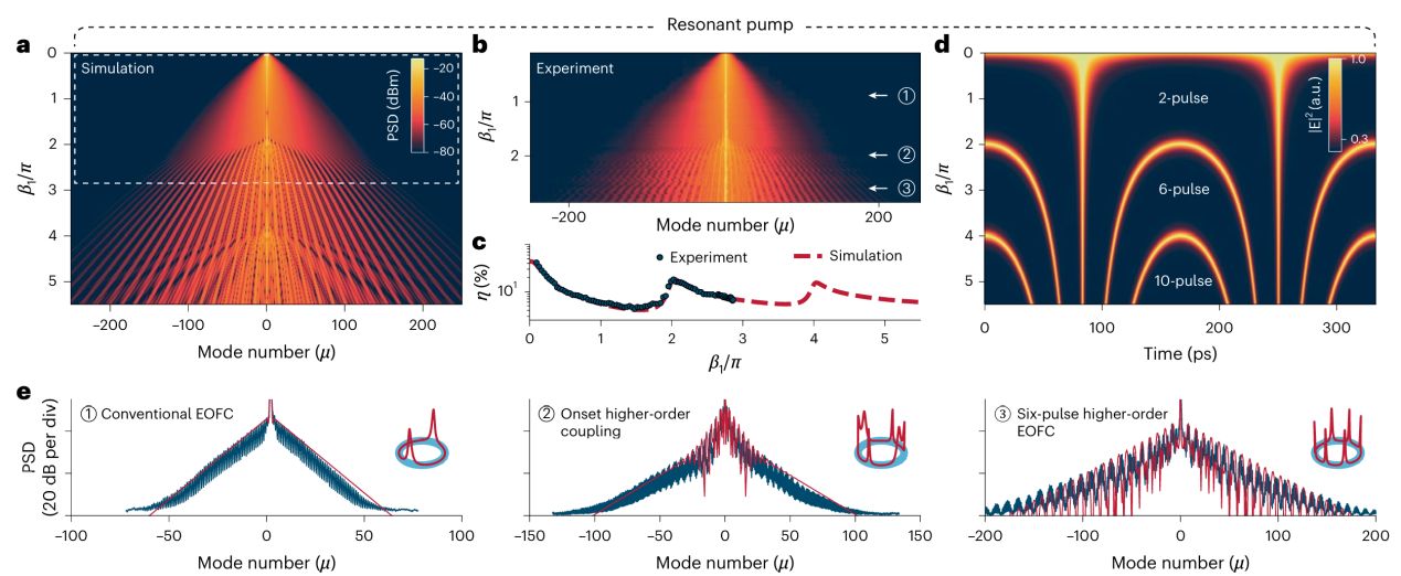 2026年3月12日,北京大学物理学院现代光学研究所胡耀文研究员、龚旗煌教授团队与哈佛大学Marko Loncar教授团队合作,在国际学术期刊《自然·物理学》(Nature Physics)上在线发表一项以《强耦合电光频率梳:通用动力学与可编程微波调控》(“Universal dynamics and microwave control of programmable resonant electro-optic frequency combs”)为题的突破性研究成果。该研究依托薄膜铌酸锂(TFLN)平台,国际首次实验观测强耦合电光频率梳,完整揭示其普适动力学,并实现微波驱动片上可编程的光频梳调控,标志着谐振型电光频率梳从“固定功能光源”迈向“全可编程光子平台”新时代。