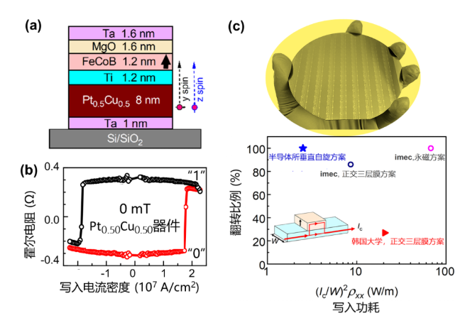 图1.(a)垂直各向异性FeCoB器件结构;(b)零磁场下实现“0”和“1”状态的100%全电翻转;(c)晶圆级均一自旋轨道矩器件阵列及其功耗和翻转比例。