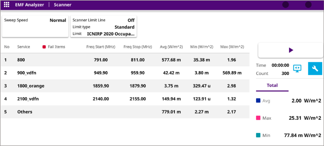 必须提前了解现场每种技术的工作频率。图 3 显示了 VIAVI OneAdvisor 800 用户界面的屏幕截图,显示了共享该站点的不同运营商在特定频率下的几种服务。对于每个服务,获得一个功率密度值,使得每个技术的单独贡献和在每个选择的站点的总功率密度能够被确定。