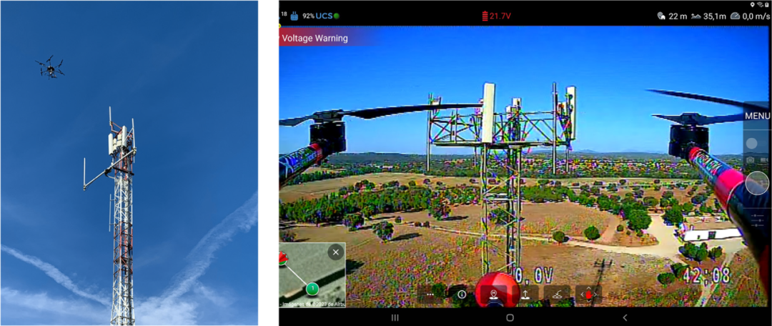 图 2 显示了测量期间现场的照片,飞行中的无人机瞄准一个基站扇区的天线。乡郊地区的天线通常有几十米高,地面操作员随时监控无人机的位置。正如照片所示,无人机悬停在距离天线仅几米的地方,方向与天线垂直。
