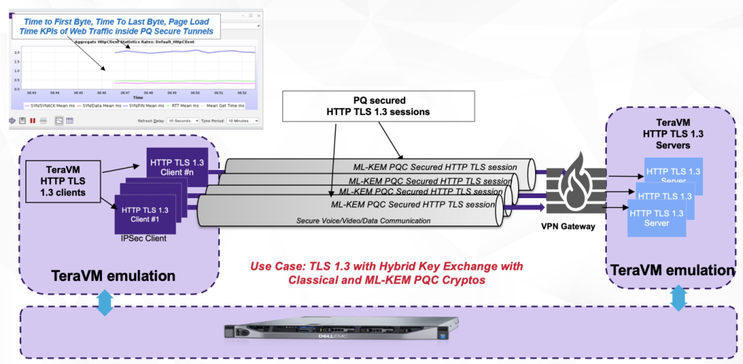 TeraVM的测试价值最终体现在真实业务场景中。通过我们的仪表,客户可实时监控加密隧道的建立时间、web流量的首包时间(TTFB)、末包时间(TTLB)等关键KPI,精准评估PQC对用户体验的影响。