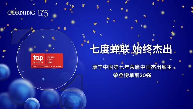 康宁凭借卓越的员工价值主张与系统化的人才管理实践,第七次荣膺“中国杰出雇主”认证,并首次跻身认证企业榜单前20强。