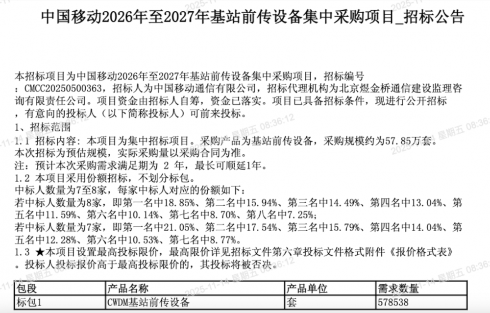 C114讯 11月14日消息(九九)中国移动采购与招标网日前发布2026年至2027年基站前传设备集中采购项目招标公告,采购基站前传设备57.85万套。预计本次采购需求满足期为2年,最长可顺延1年。
