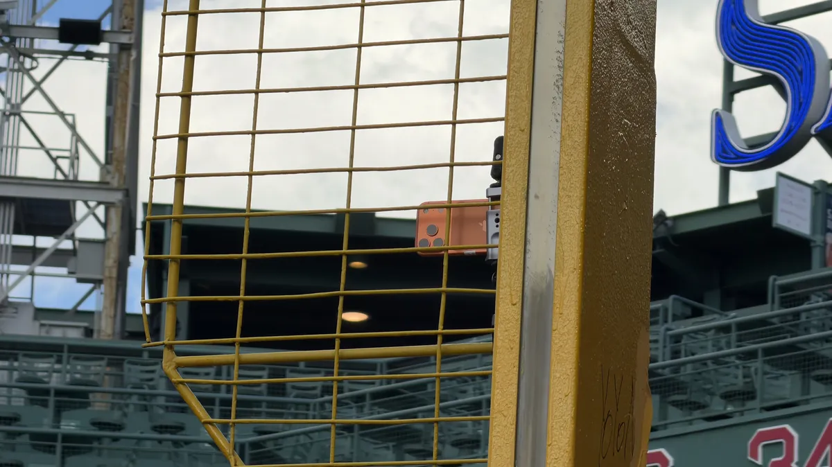 IT之家援引博文介绍,苹果团队将一部手机用夹具固定在芬威球场著名的右外野“佩斯基标杆”高处,另一部则巧妙地藏进“绿色怪物”(Green Monster)全垒打墙的记分板缝隙中。