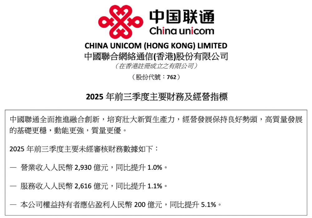 C114讯 10月22日消息 今日,中国联通公布2025年前三季度业绩。