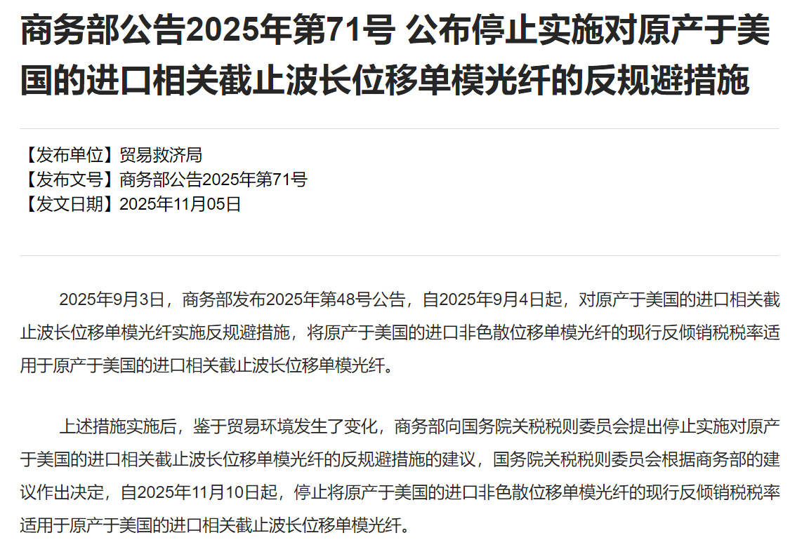 11月5日,商务部发布公告称,自2025年11月10日起,停止实施对原产于美国的进口相关截止波长位移单模光纤的反规避措施。