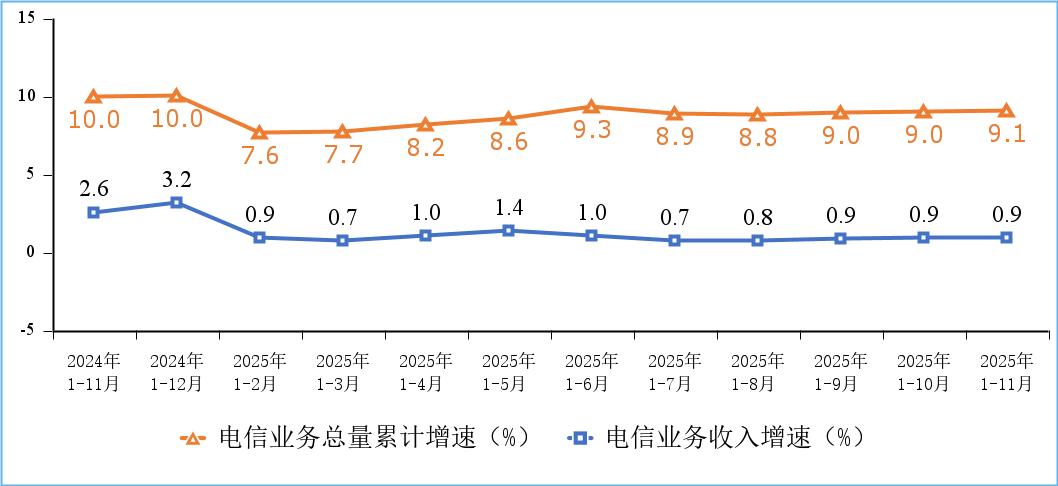C114讯 12月23日消息(九九)工业和信息化部运行监测协调局昨日发布2025年前11个月通信业经济运行情况。前11个月,电信业务收入累计完成16096亿元,同比增长0.9%。按照上年不变价计算的电信业务总量同比增长9.1%。
