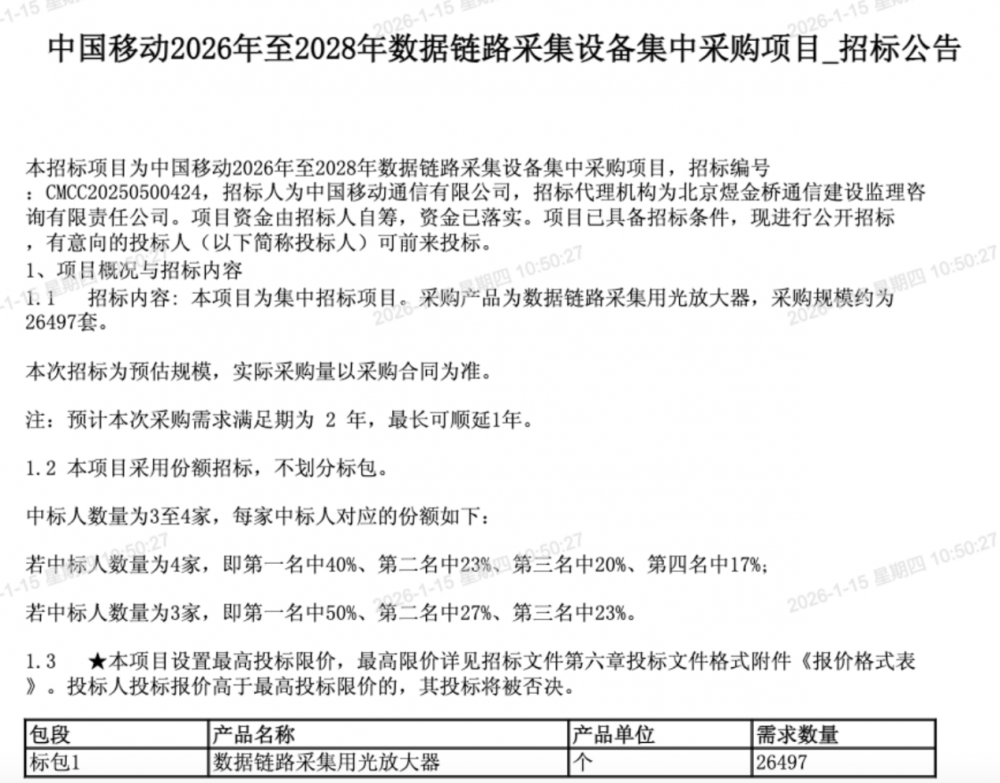 C114讯 1月15日消息(九九)中国移动采购与招标网日前发布2026年至2028年数据链路采集设备集中采购项目招标公告,采购产品为数据链路采集用光放大器,采购规模约为26497套。预计本次采购需求满足期为2年,最长可顺延1年。