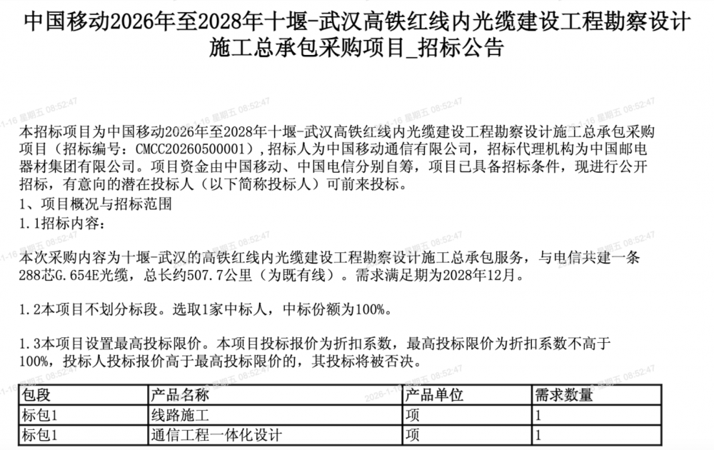 C114讯 1月16日消息(九九)中国移动采购与招标网日前发布2026年至2028年十堰-武汉高铁红线内光缆建设工程勘察设计施工总承包采购项目招标公告。采购内容为十堰-武汉的高铁红线内光缆建设工程勘察设计施工总承包服务,与电信共建一条288芯G.654E光缆,总长约507.7公里(为既有线)。需求满足期为2028年12月。