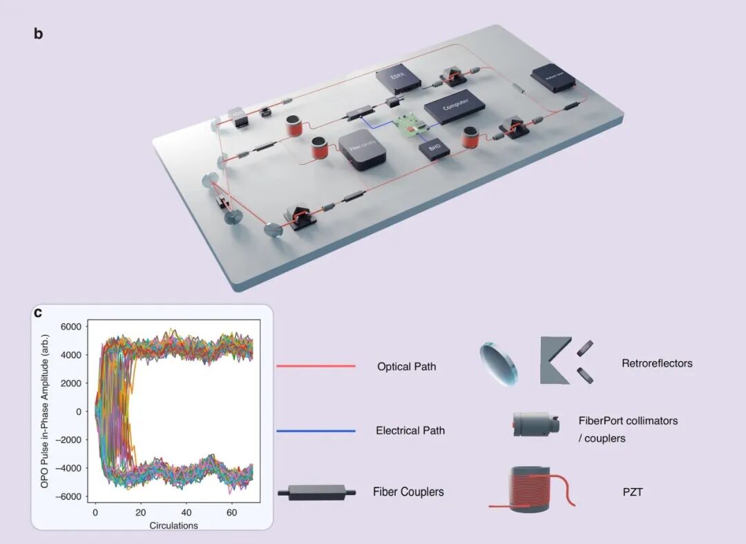 该研究通过飞秒激光泵浦技术,成功实现“空间光路+光纤光路”的异构光路体系架构的优化策略整合,大幅提高相干光量子计算机的量子优越性,使得相干光量子计算机在量子计算性能、系统稳定性和实际应用三个维度实现了标志性突破。