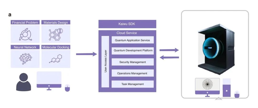 a图:相干光量子计算服务作业流程示意图。完整流程包括用户向云服务器提交计算任务(如分子对接、金融分析、神经网络和材料设计),云服务器将这些任务转换为伊辛模型矩阵,并通过Kaiwu SDK传输至相干光量子计算机。FPGA连接本地计算机,利用获取的伊辛模型矩阵进行计算。
