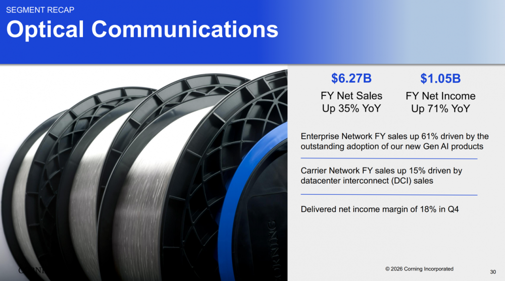 康宁介绍,光通信的企业网业务2025年实现营收31.95亿美元,同比增长61%,主要得益于康宁新推出的人工智能相关产品的广泛应用。